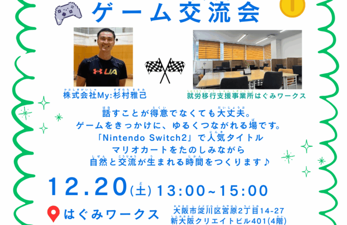 ゲームをきっかけに、ゆるくつながる交流会を開催します【12/20(土)】 はぐみワークスでは、「就職…